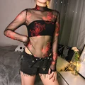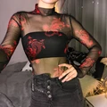 Best Offer Sweetown Transparent Sexy Mesh Bodysuit New Arrival 2019 Long Sleeve Dragon Print Body Mujer Romper with FREE Worldwide Shipping!