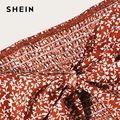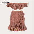 Discount Offer SHEIN Knotted Shirred Floral Bardot Top And Ruffle Wrap Skirt Set Boho Rust Asymmetrical Off Should with Free Shipping Worldwide!